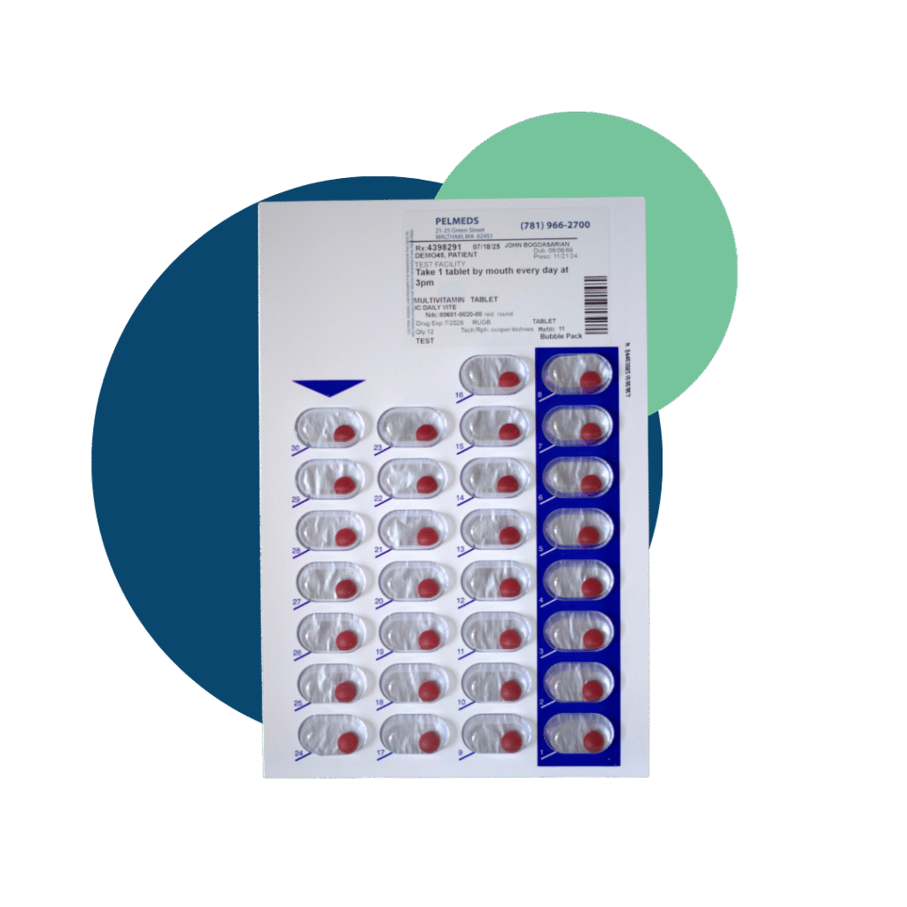 Medications sealed in individual, clearly labeled doses for easy tracking. Compliance packaging